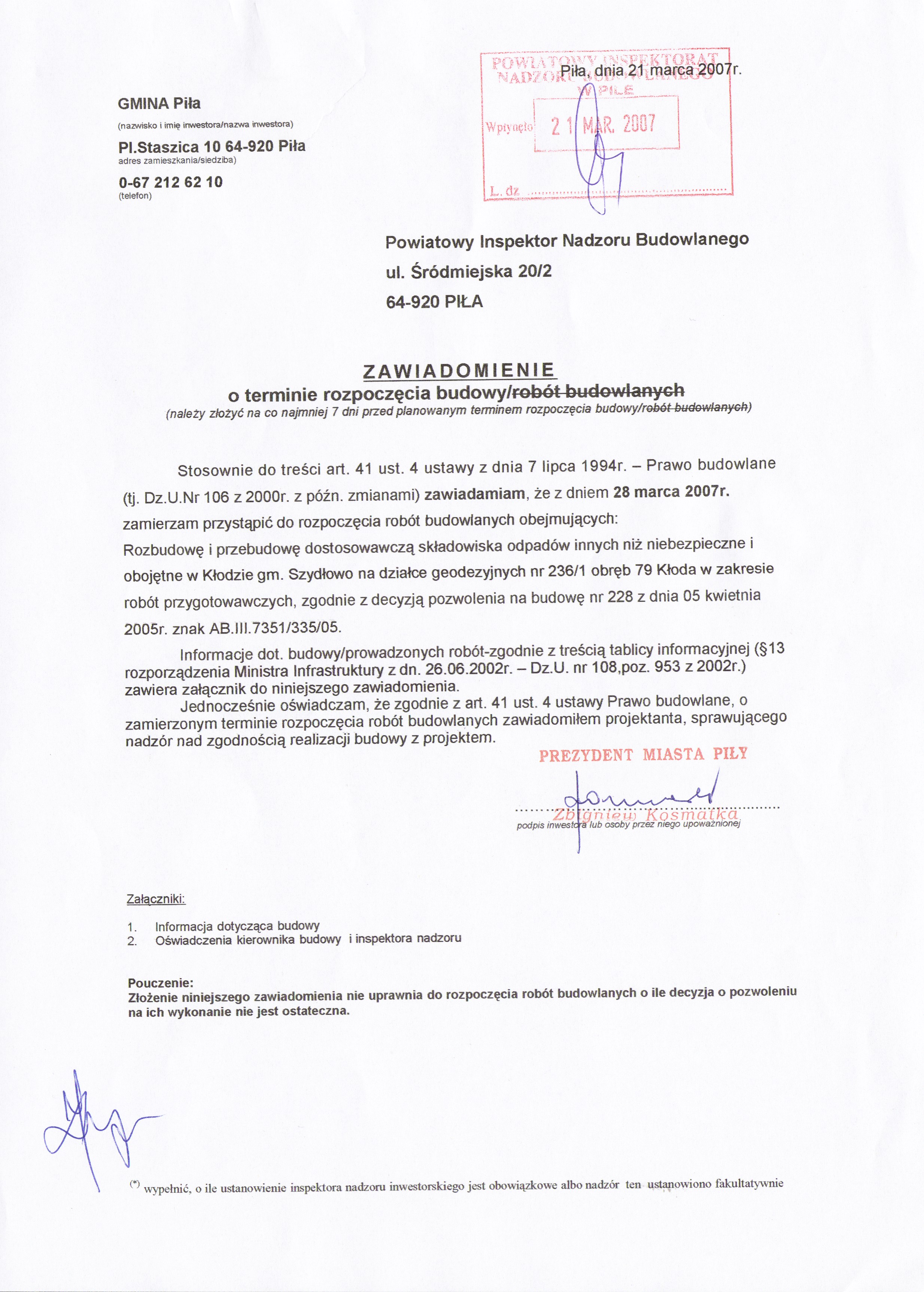 Przetargi archiwalne: Modernizacja składowiska odpadów komunalnych Gminy Piła w miejscowości Kłoda gm. Szydłowo - rozbudowa i przebudowa dostosowywawcza Odpowiedzi na pytania (12.03.2008r. i 17.03.2008r.) Zmiana terminu...